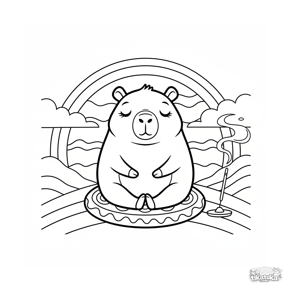Página para colorear para niños de 4-6 años: un carpincho medita en posición de loto sobre un cojín en una colina contra el atardecer. Formas limpias y simples, detalle moderado.