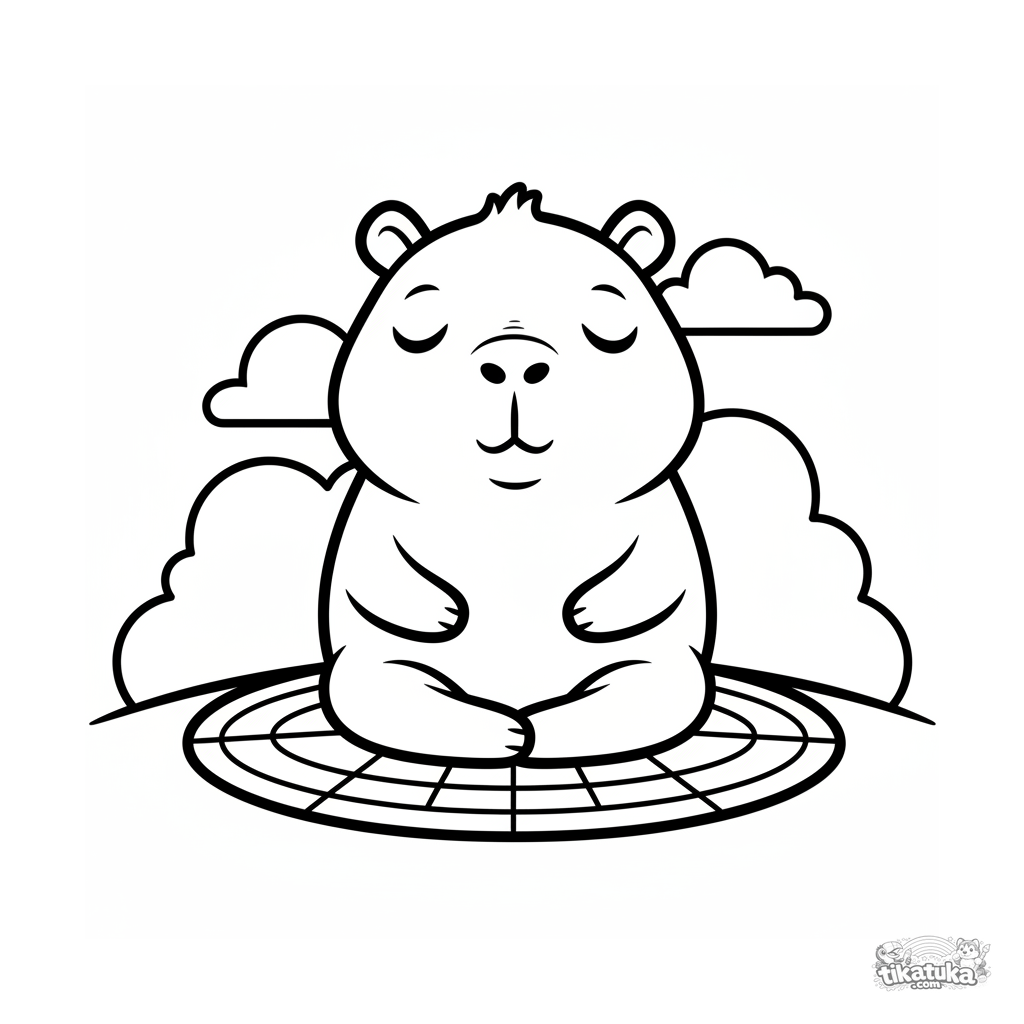 Página para colorear simple estilo chibi para niños pequeños 2-3: un carpincho medita en postura de loto al atardecer. Formas muy grandes y amigables.