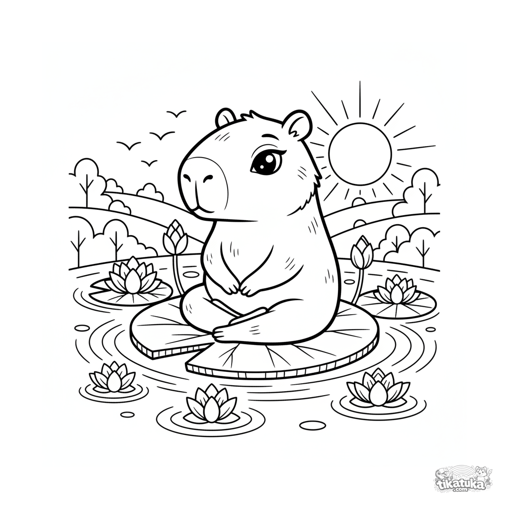 Página para colorear para 4-6 años: un capibara medita en una hoja grande en un estanque con atardecer. Estilo folk lubok, contornos decorativos claros.