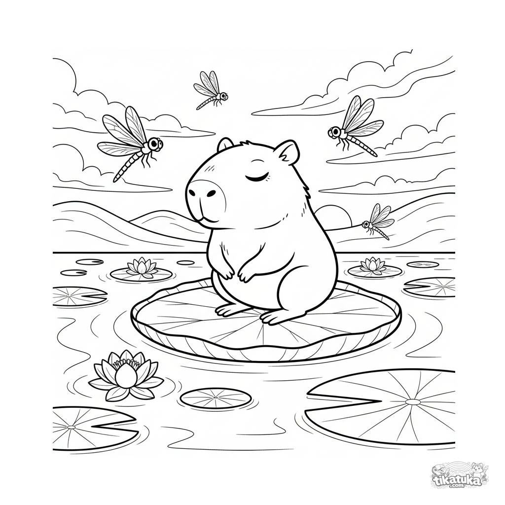 Página para colorear para niños de 4-6 años: un capibara tranquilo meditando en un gran nenúfar en un estanque al atardecer.