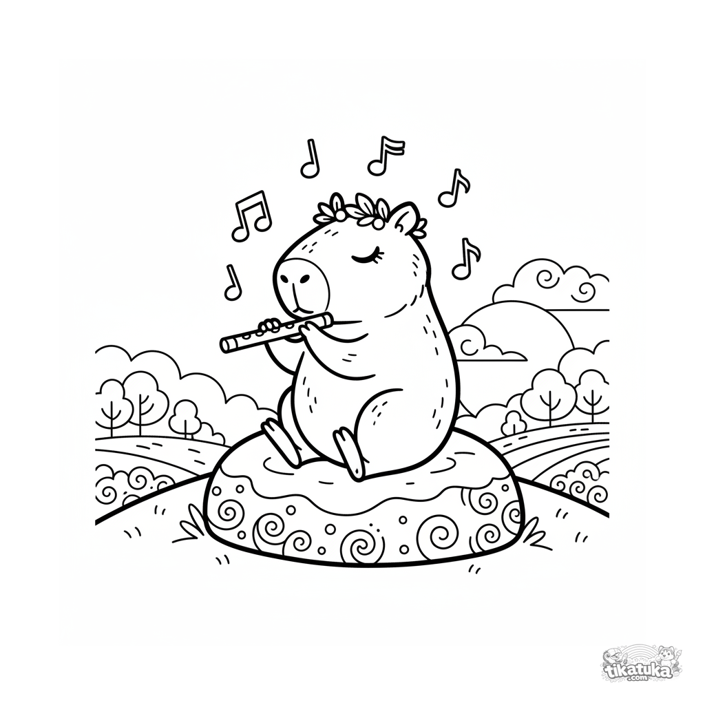 Página para colorear estilo folklórico para niños de 4-6 años: un carpincho toca la flauta al atardecer. Notas musicales decorativas.
