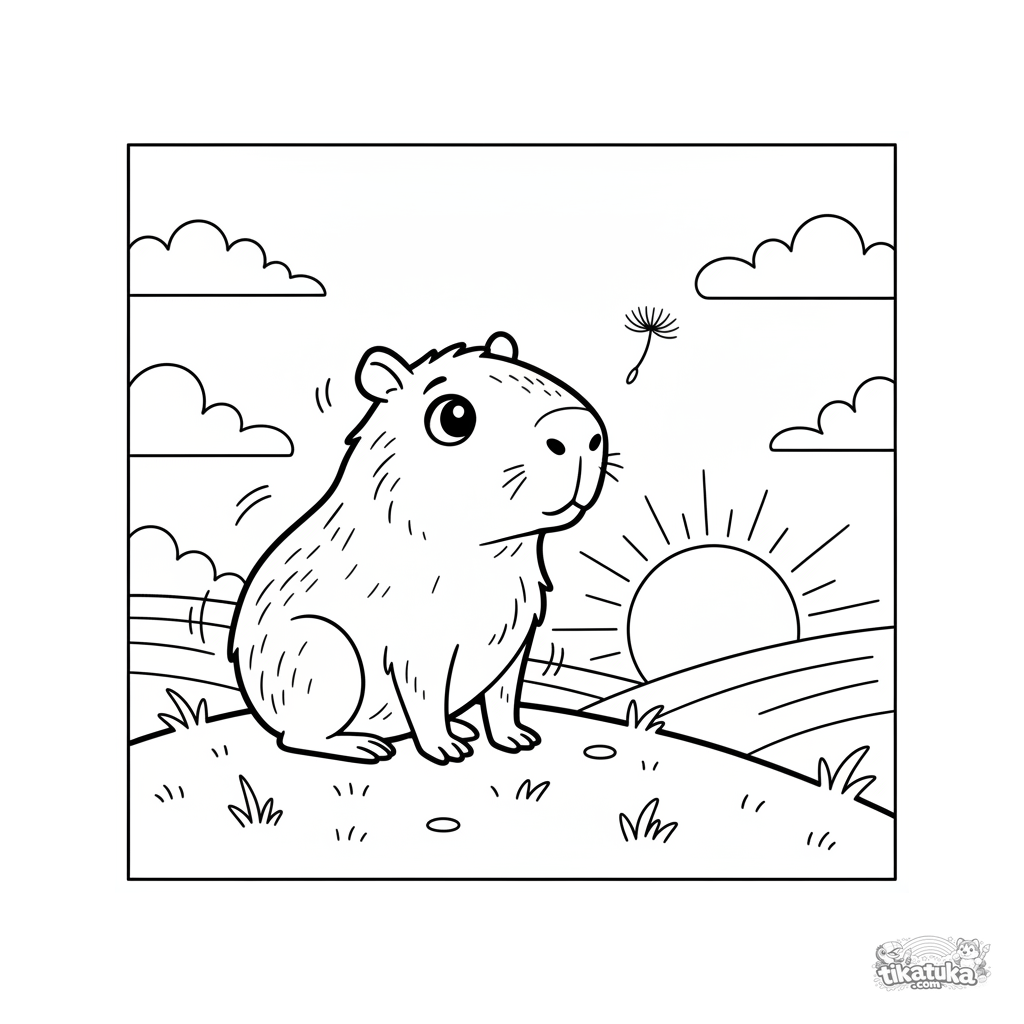 Página para colorear de un capibara observando el atardecer en una colina. Escena de calma y contemplación para niños de 7 a 9 años.
