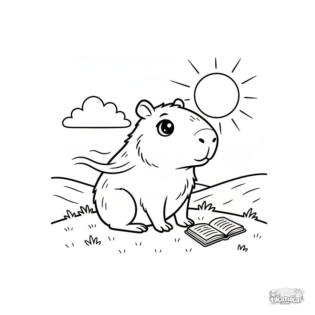 Página para colorear de un carpincho filósofo mirando el atardecer en una colina. Para niños de 7 a 9 años. Escena de calma y contemplación con un libro.