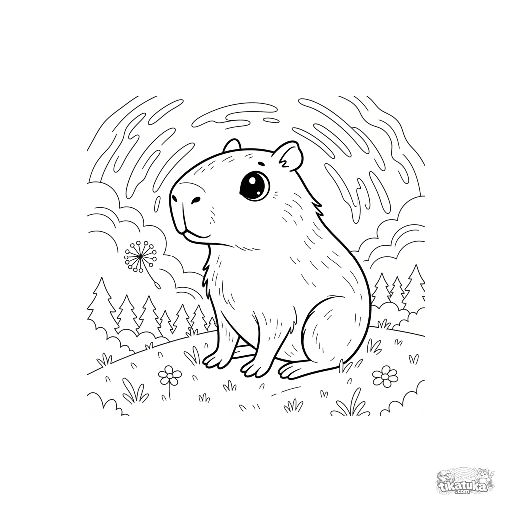 Página para colorear de un capibara filosófico observando el atardecer en una colina. Para niños de 7 a 9 años. Escena de calma y contemplación.