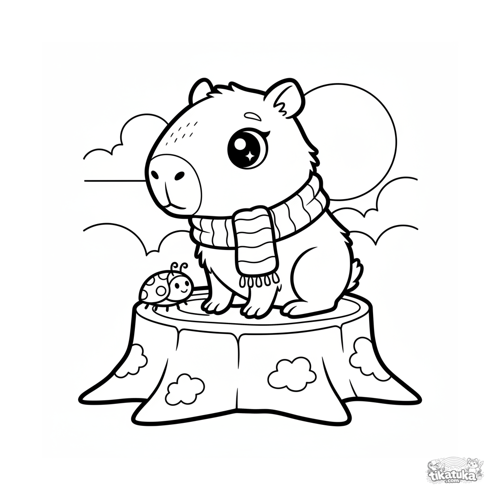 Página simple para colorear para niños pequeños 2-3: un bebé capibara con bufanda sentado en un tocón mirando el atardecer. Formas grandes, márgenes amplios.