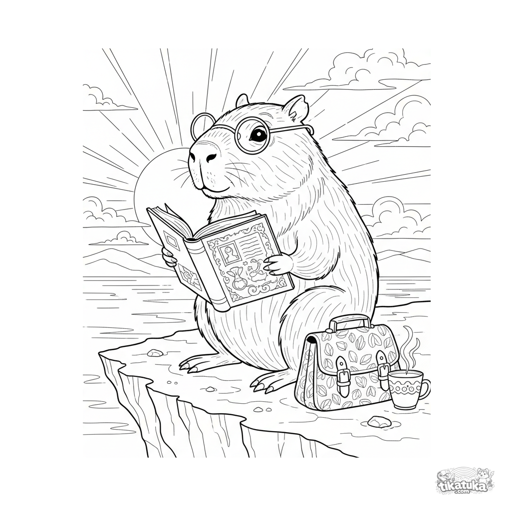 Página para colorear detallada para 10-12 años: un carpincho con gafas leyendo un libro al borde de un acantilado, observando el atardecer. Escena de sabiduría y reflexión filosófica.