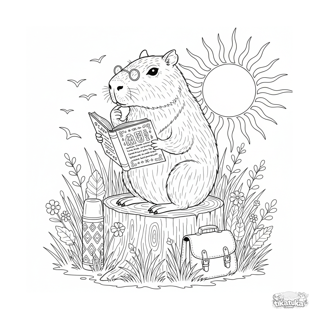 Página para colorear detallada para niños de 10-12 años: un capibara con gafas lee un libro en un tocón al atardecer. Escena para amantes de los detalles.