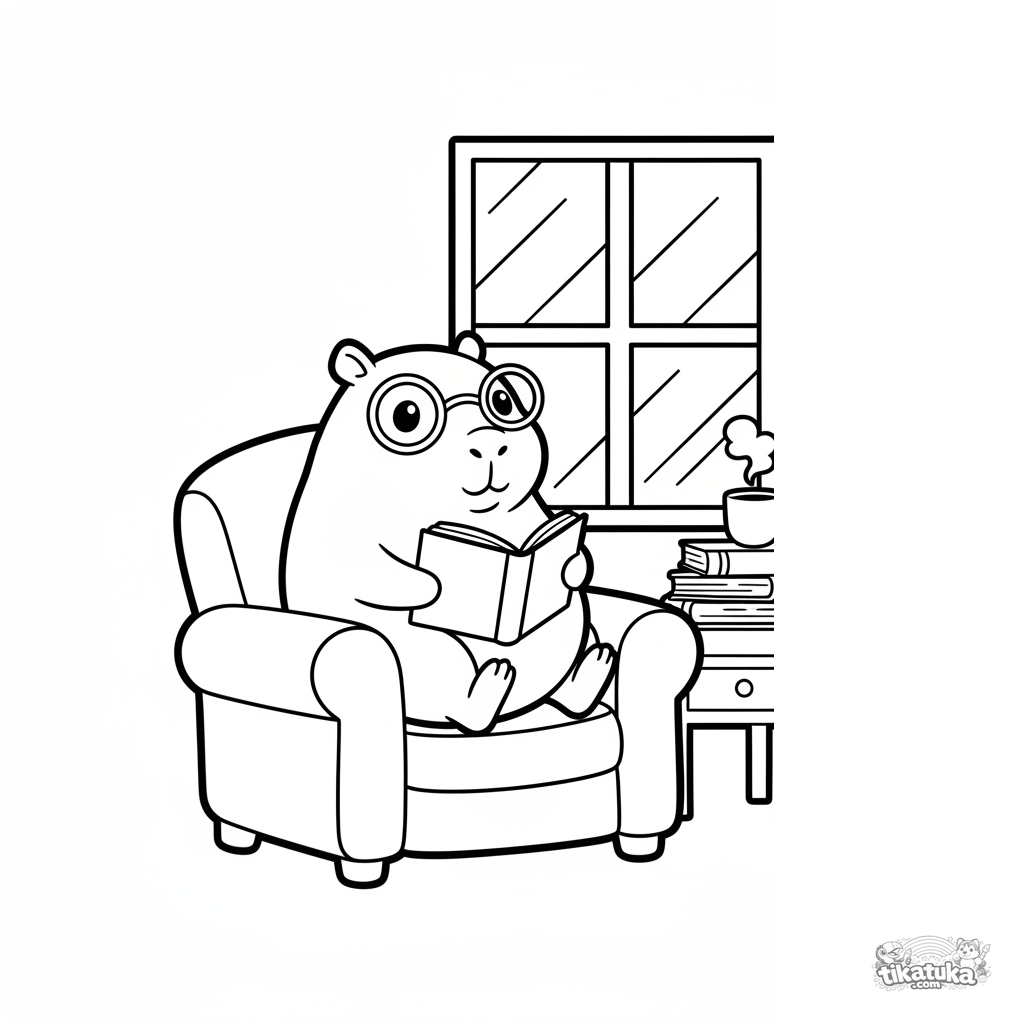 Página simple para niños pequeños 2-3: un carpincho con gafas leyendo un libro en un sillón junto a la ventana. Formas grandes.