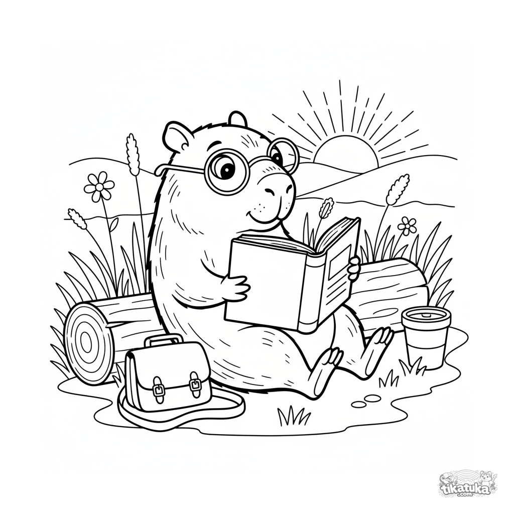 Página para colorear para niños de 7-9 años: un capibara con gafas leyendo un libro a la luz del atardecer.