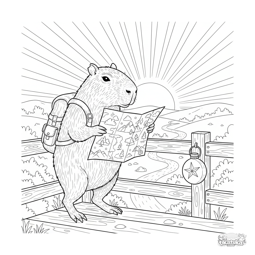 Página detallada para colorear para niños de 10-12 años: un carpincho viajero con mochila estudia un mapa en un mirador contra el atardecer. Estilo guía de campo.