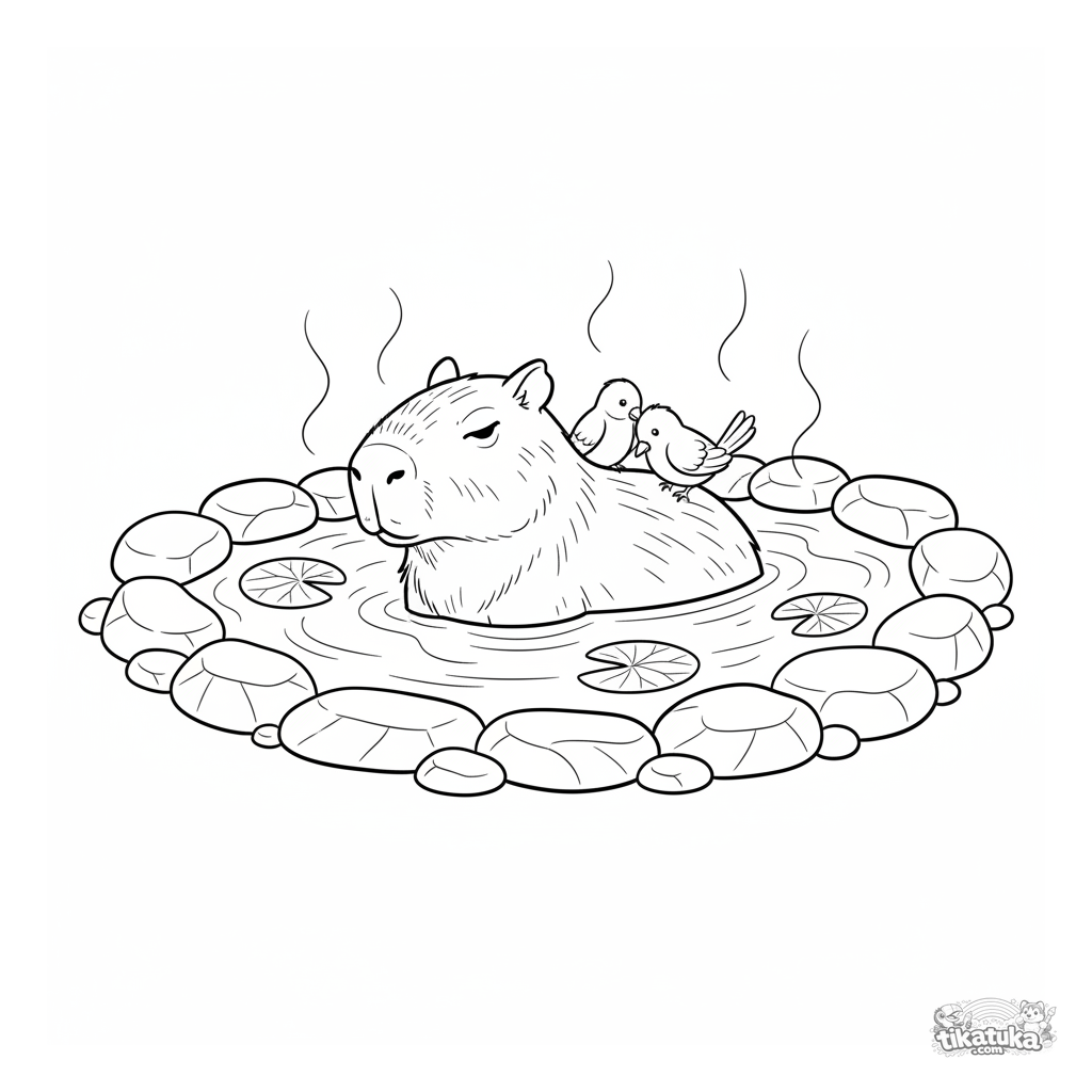 Página para colorear para niños 4-6 años: una capibara serena disfruta de un baño relajante en un manantial natural con pájaros descansando en su lomo.