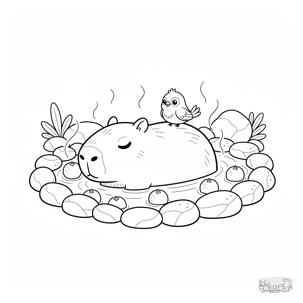Página para colorear para niños de 4-6 años: una tranquila capibara se remoja en un manantial caliente con naranjas flotando cerca y un pajarito en su espalda.