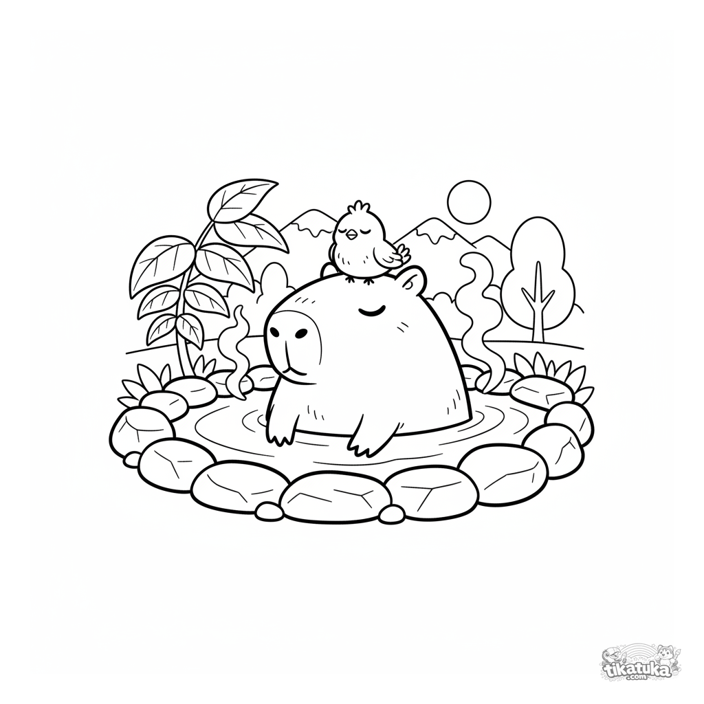 Página para colorear para niños de 4-6 años: una capibara disfruta de un baño relajante en aguas termales con un pajarito posado en su cabeza. Escena tranquila y linda para colorear.