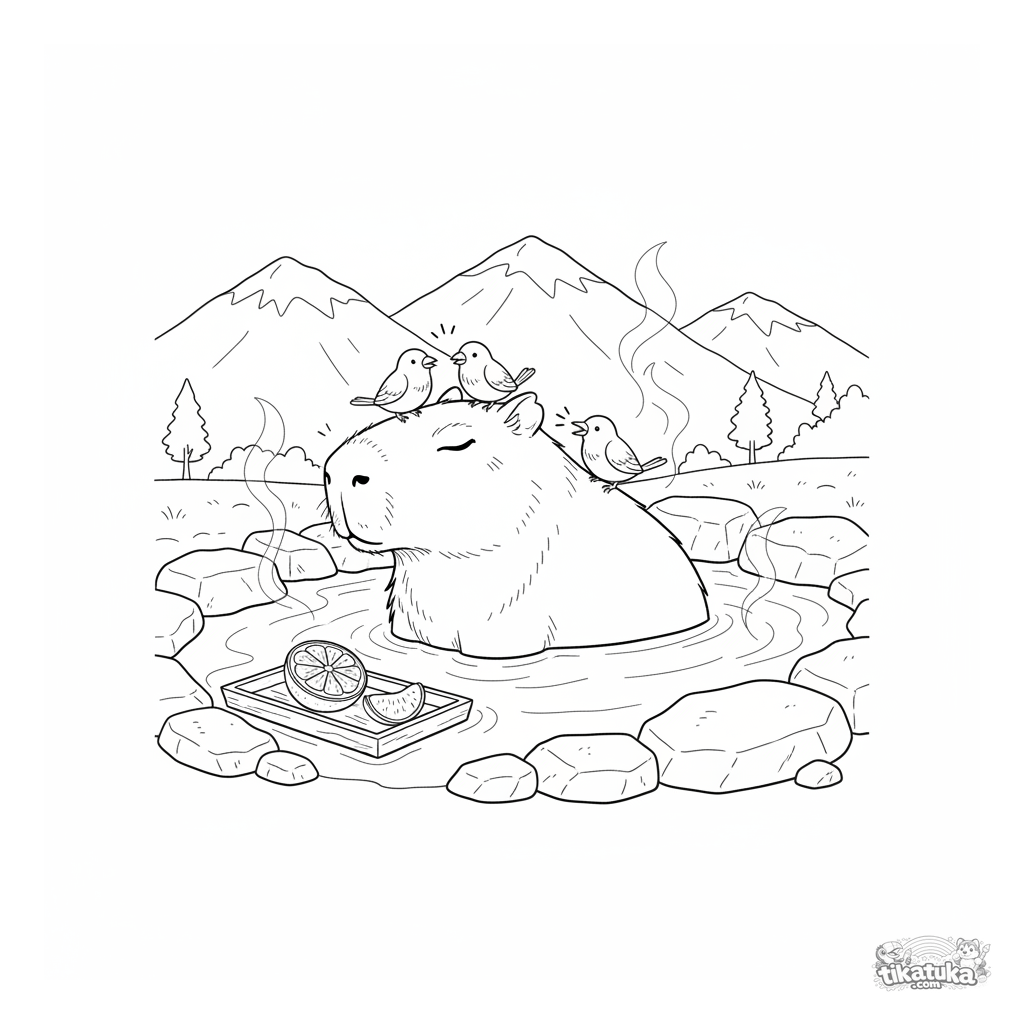 Página para colorear para niños de 4-6 años: una capibara se relaja en aguas termales, pequeños pájaros se posan en su lomo, una naranja flota cerca en una bandeja.