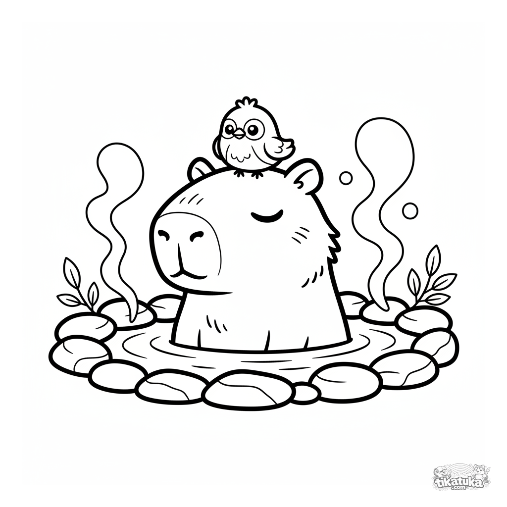 Página para colorear simple para niños pequeños 2-3: una gran y amigable capibara se relaja en un manantial caliente con un pajarito en la cabeza. Formas grandes y amigables.
