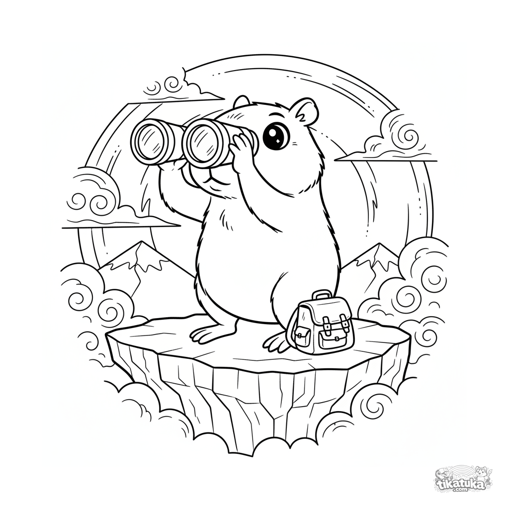 Página para colorear para niños 4-6: un carpincho explorador con prismáticos de pie en una roca, examinando el atardecer.