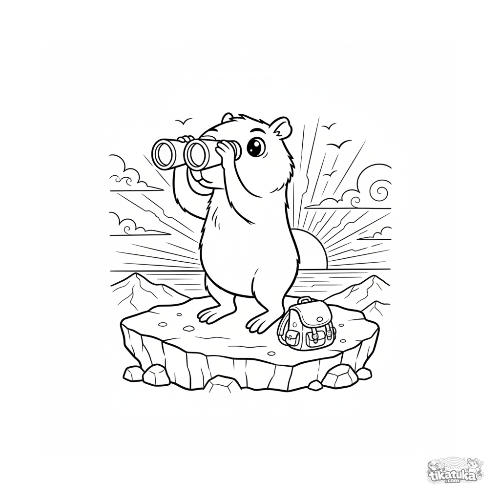 Página para colorear para niños de 4-6 años: un curioso capibara de pie en una roca mirando la puesta de sol con prismáticos. Escena dinámica y clara.