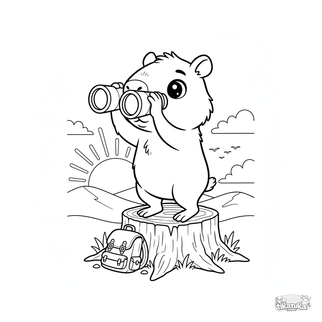 Página para colorear para niños de 4-6 años: un curioso capibara de pie en un tocón observando el atardecer con binoculares. Pose dinámica, formas claras.