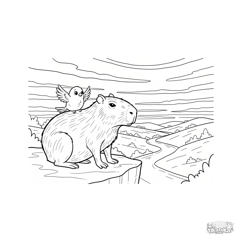 Página para colorear para niños 7-9: un carpincho y un pajarito sentados en una roca, contemplando el atardecer sobre un valle. Conmovedora escena de amistad silenciosa y paz.