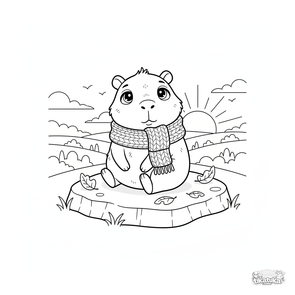Página para colorear para niños 4-6: un carpincho acogedor con bufanda sentado en una roca contemplando el atardecer. Escena simple y linda con hojas de otoño.