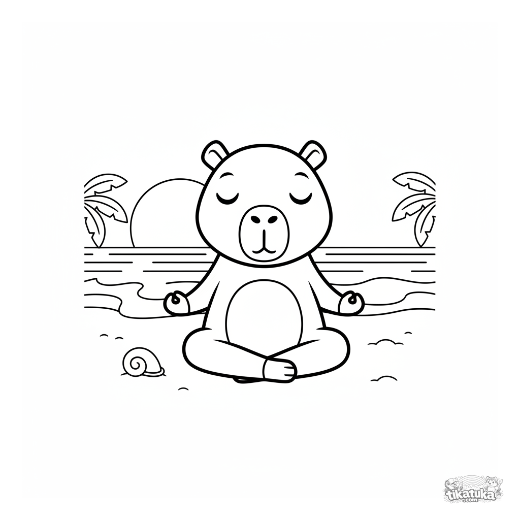 Página para colorear para 7-9 años: un carpincho tranquilo practica yoga en una playa desierta al atardecer.