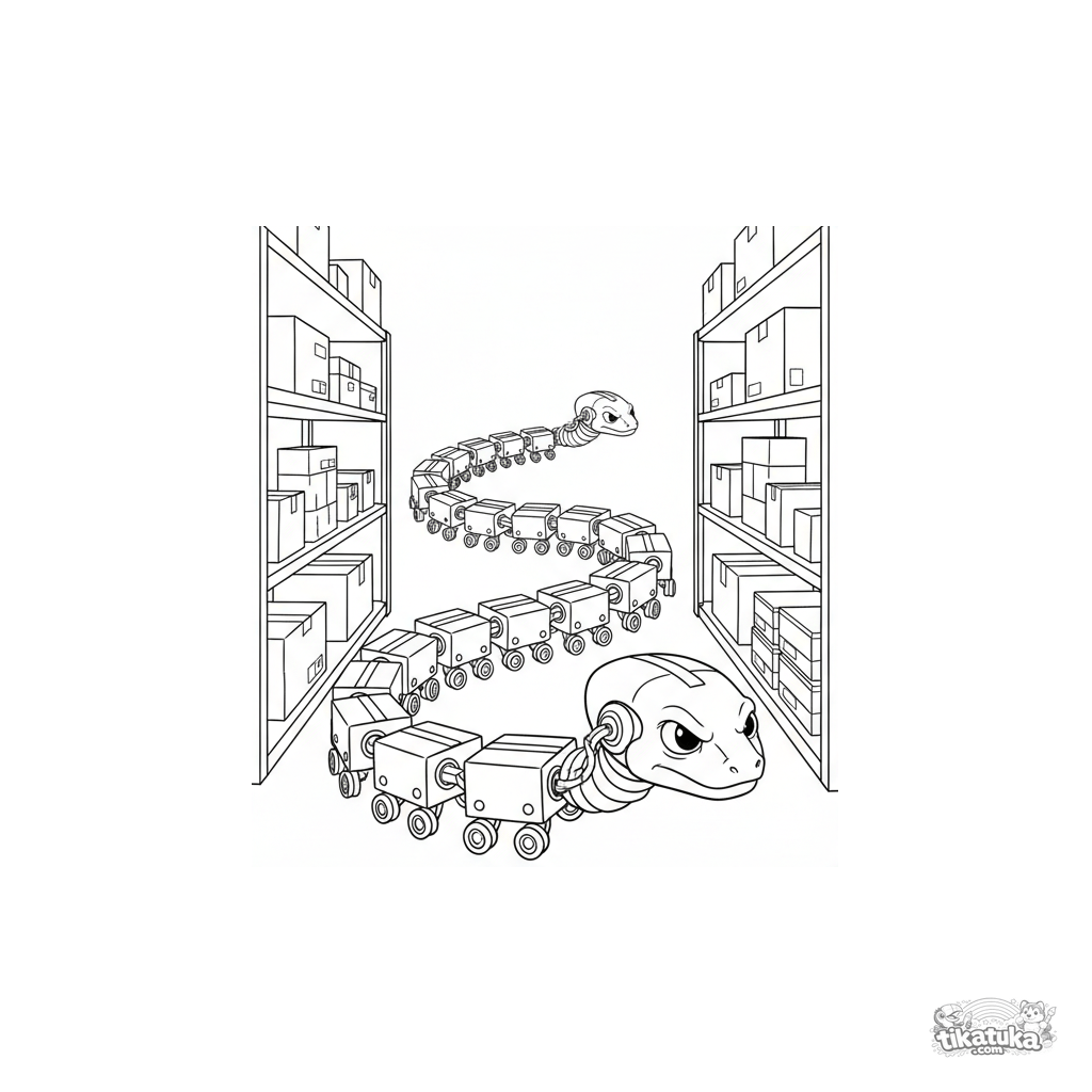 Página para colorear para niños de 4-6 años: un robot largo segmentado como una serpiente transporta carga por un pasillo estrecho. Líneas limpias, estilo guía de campo, formas claras.