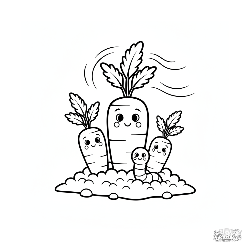 Página simple para colorear para toddlers 2-3: una familia de zanahorias en la tierra. Formas grandes, caritas, pocos detalles.