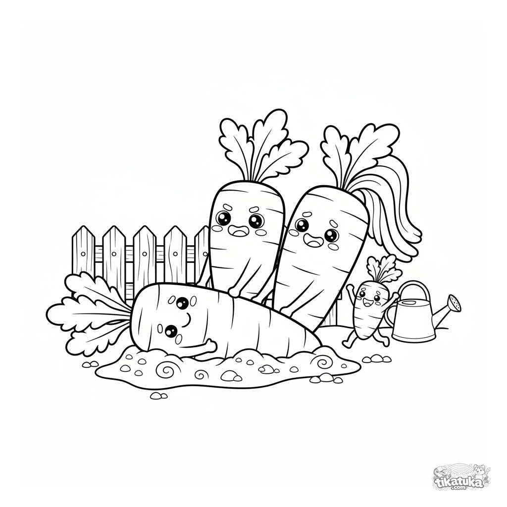 Página para colorear para niños 4-6: una familia de zanahorias intenta sacar una zanahoria gigante del huerto. Escena tierna estilo libro de cuentos.