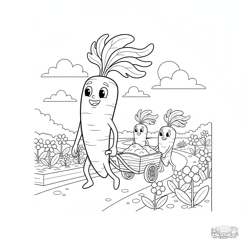 Página para colorear para niños 4-6: una familia de zanahorias tira de un carro por un camino de huerto. Escena tierna con detalles simples.