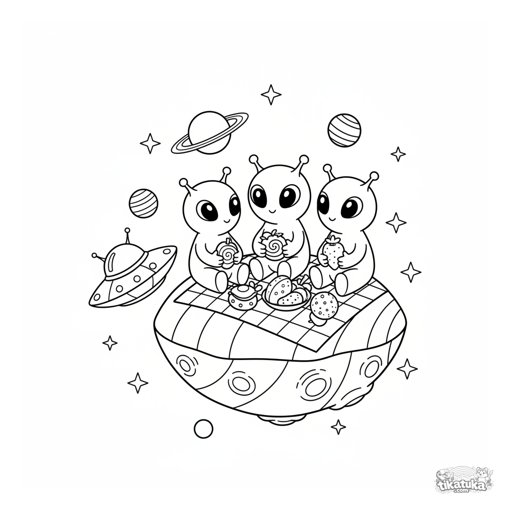 Divertida página para colorear: una familia de alienígenas hace un picnic en un asteroide arcoíris. Para niños de 4-6 años. Nave espacial, estrellas y frutas espaciales.