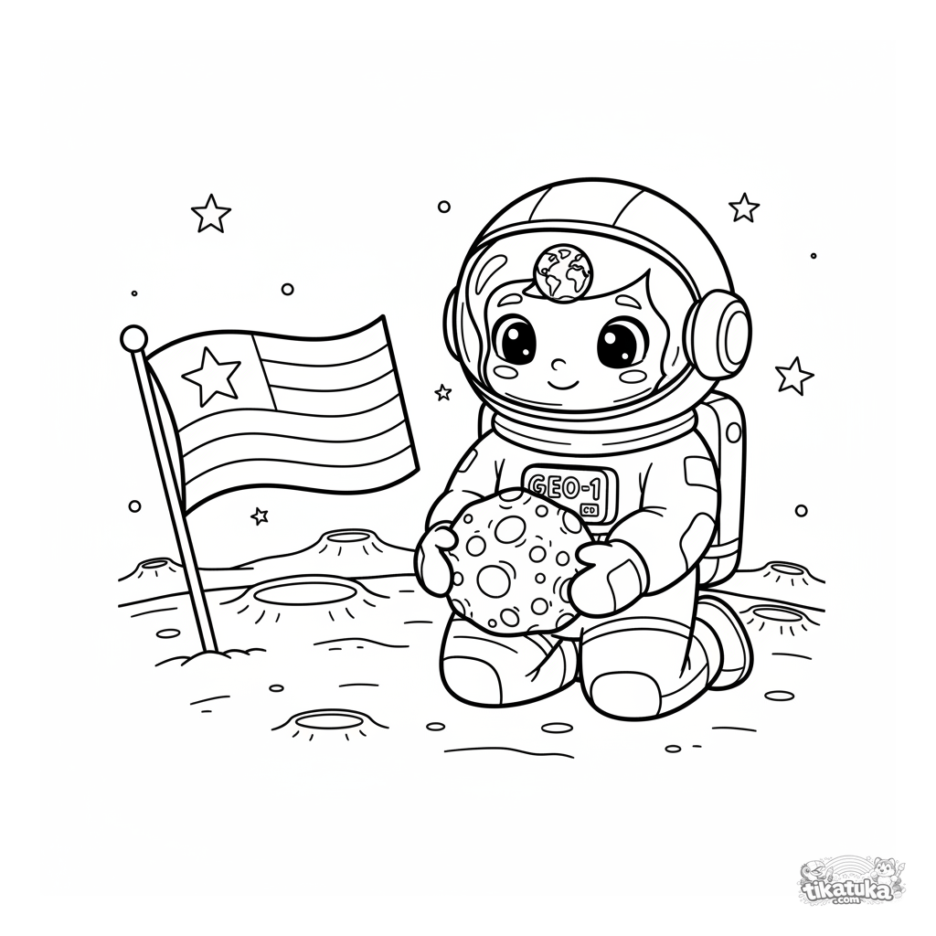 Página para colorear con tema espacial: un astronauta geólogo examina una muestra de roca lunar en la superficie de la luna. Para niños de 5 a 8 años. Detalles del traje espacial, paisaje lunar y estrellas.