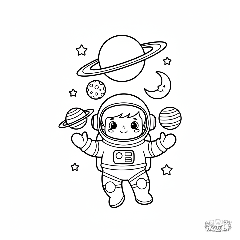 Una página para colorear de Espacio con detalle Fácil. Es adecuada para edades 3-6 años, se imprime bien en casa y se abre enseguida en modo en línea.
