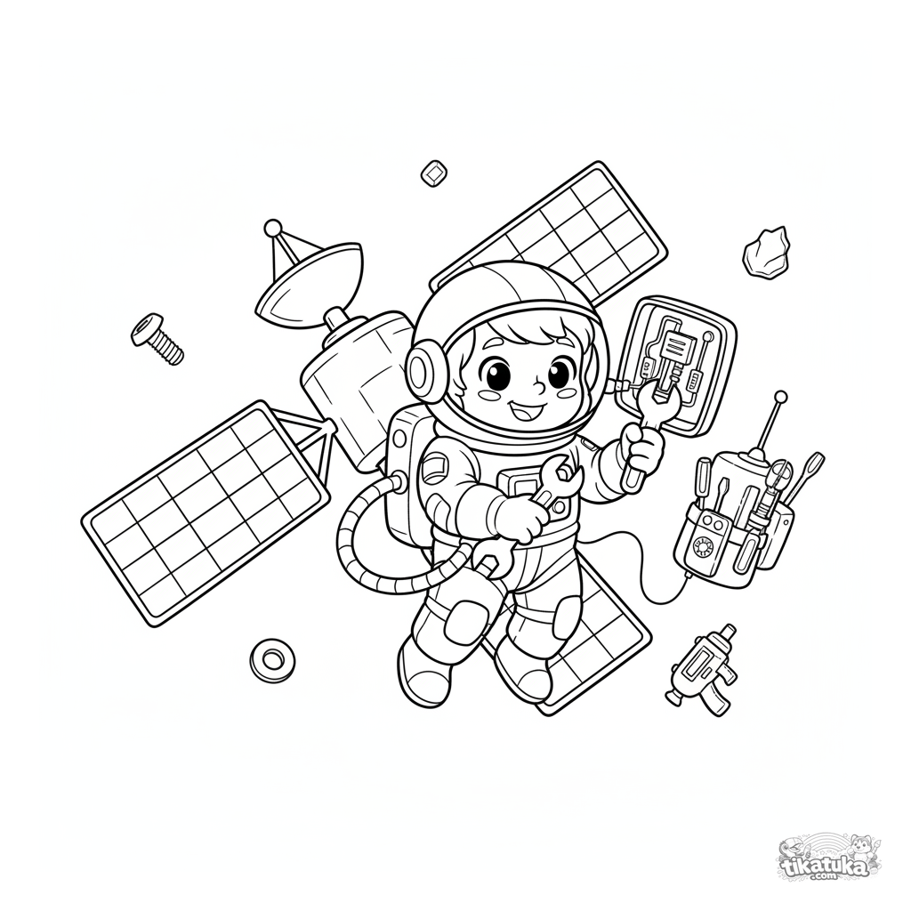 Página para colorear de un astronauta en el espacio exterior, reparando un satélite con herramientas. Para niños de 5 a 8 años. Fondo blanco simple para colorear.