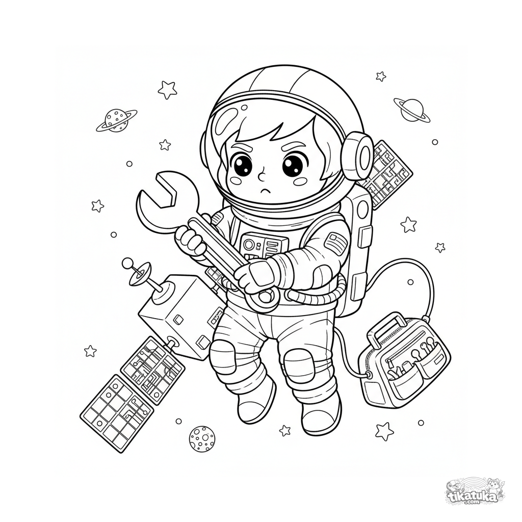 Página para colorear de un astronauta reparando un satélite flotando en el espacio. Para niños de 6-9 años. Imagen detallada.