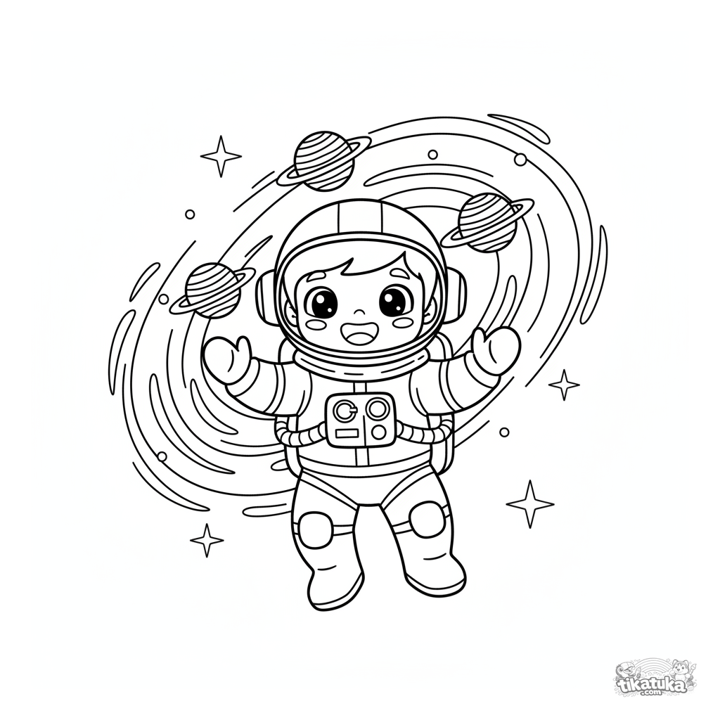 Página para colorear para niños de 5 a 8 años: un astronauta alegre flota en el espacio, haciendo malabares con tres pequeños planetas anillados sobre un fondo de nebulosa.
