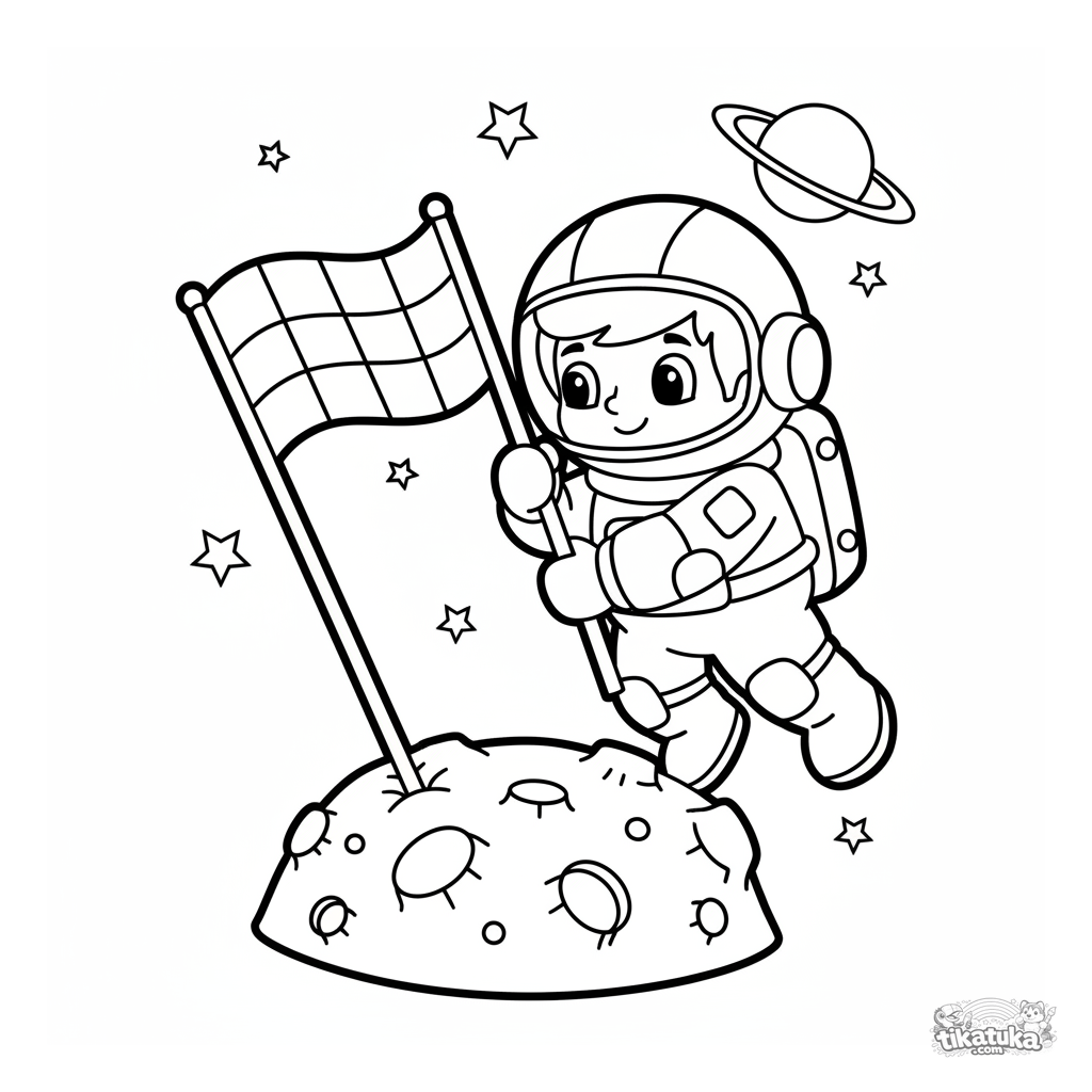 Página simple para colorear para niños pequeños 2-3 años: un astronauta amigable planta una bandera en un asteroide. Formas grandes y claras con mucho espacio libre.