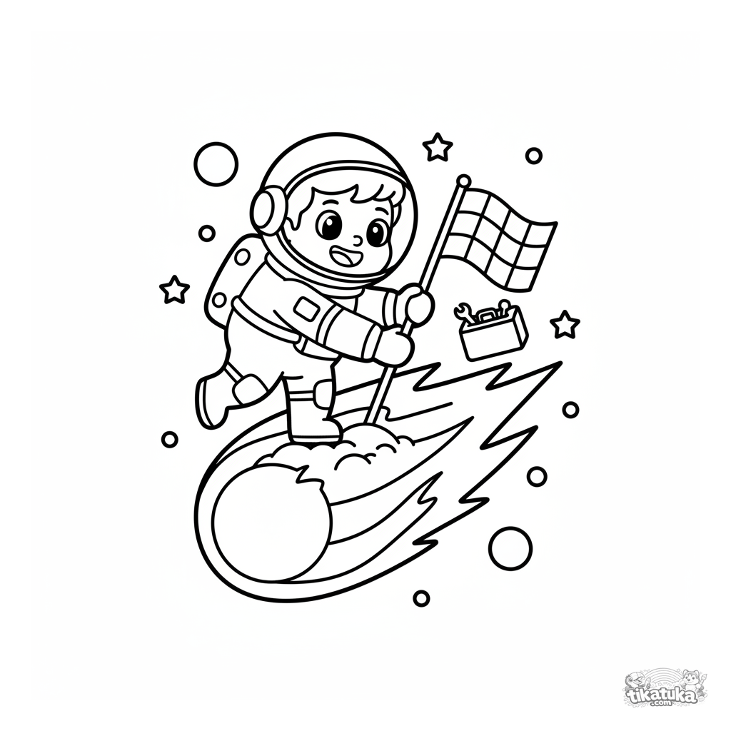 Página para colorear fácil para niños pequeños de 2-4 años. Un astronauta de dibujos animados planta una bandera en un cometa arcoíris volador.