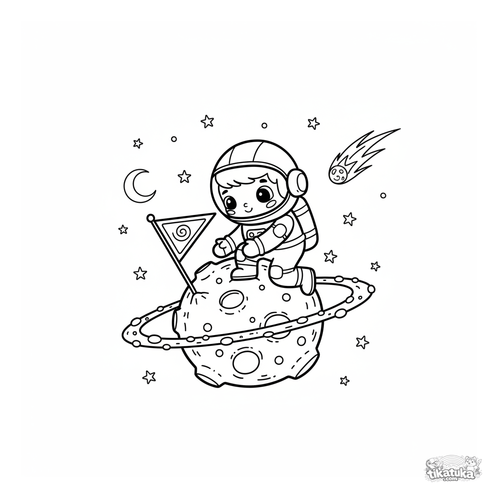 Página para colorear de un astronauta plantando una bandera en un asteroide con anillos. Para niños de 5 a 8 años. Escena de exploración espacial con planetas y un cometa.