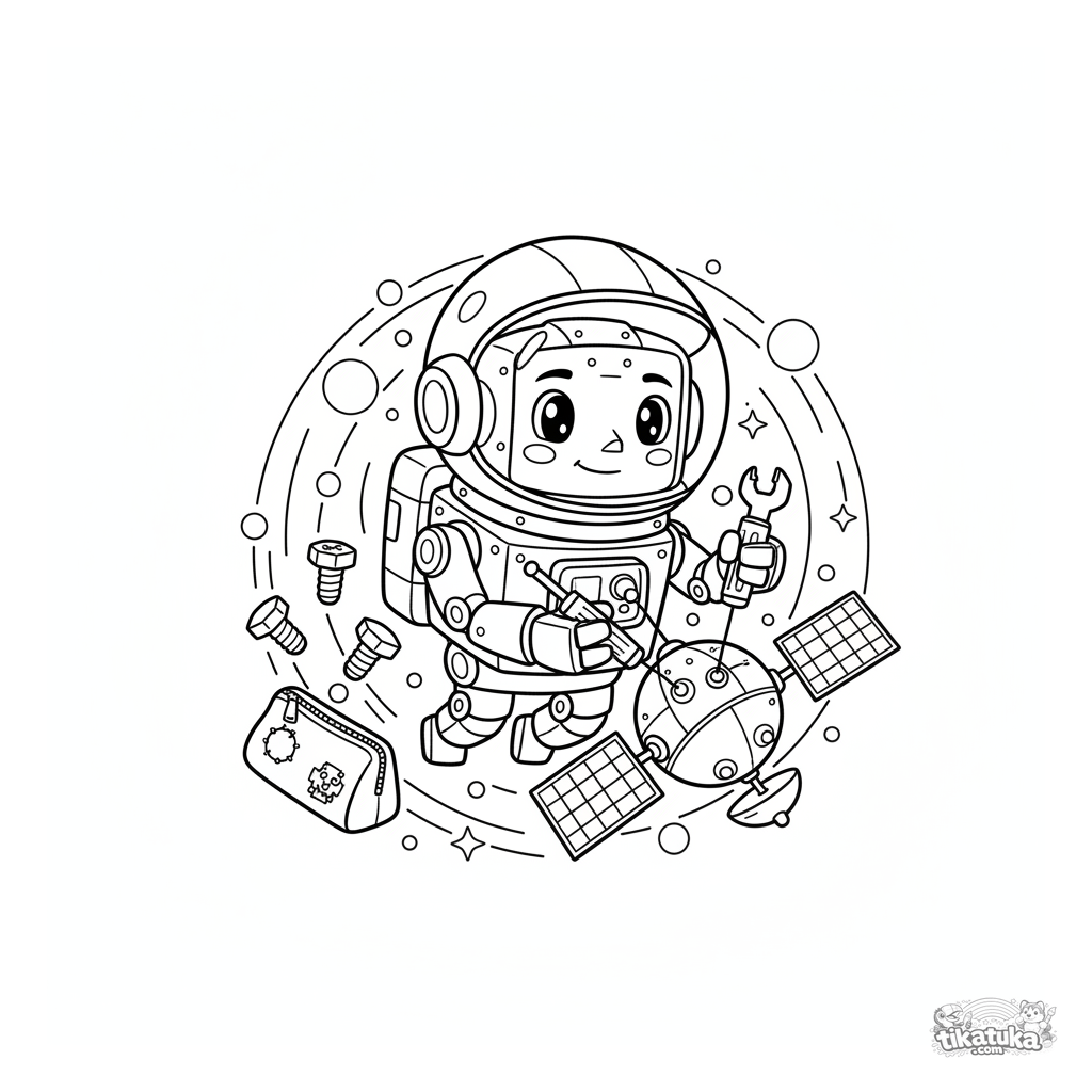 Página para colorear de un robot astronauta amigable reparando un satélite en el espacio exterior. Para niños de 5 a 8 años.