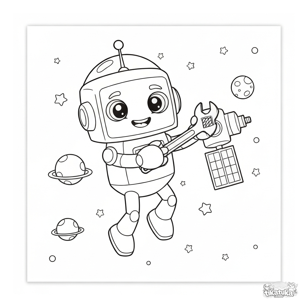 Página espacial para colorear para niños de 5 a 8 años. Un robot astronauta flota en el espacio reparando un satélite.