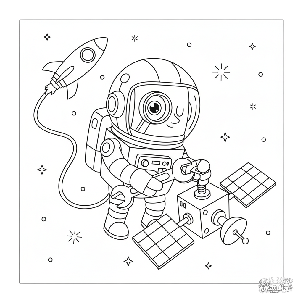 Página para colorear de un robot astronauta arreglando un satélite en el espacio exterior. Para niños de 5 a 8 años. Divertida y amigable escena espacial.