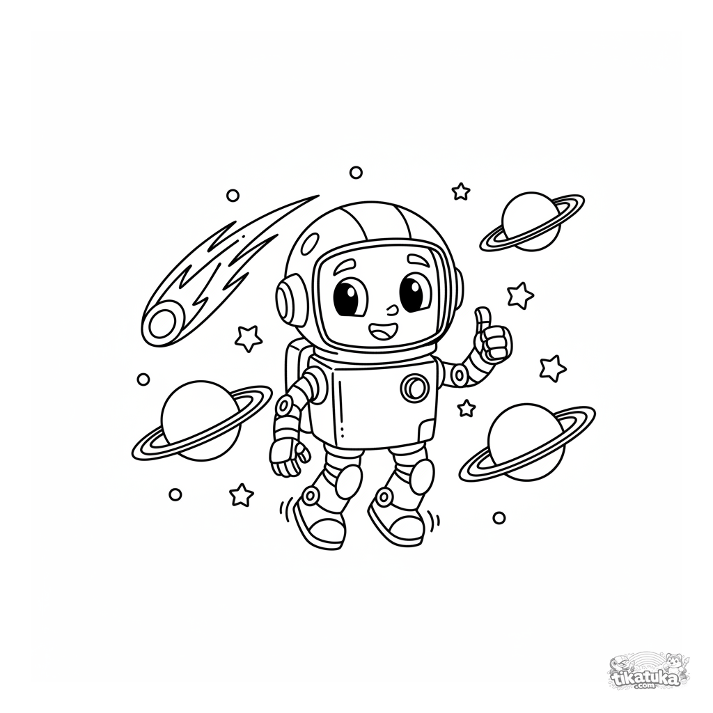 Página para colorear de un robot astronauta amigable flotando entre planetas anillados y un cometa. Para niños de 5-8 años. Escena espacial sobre fondo blanco.