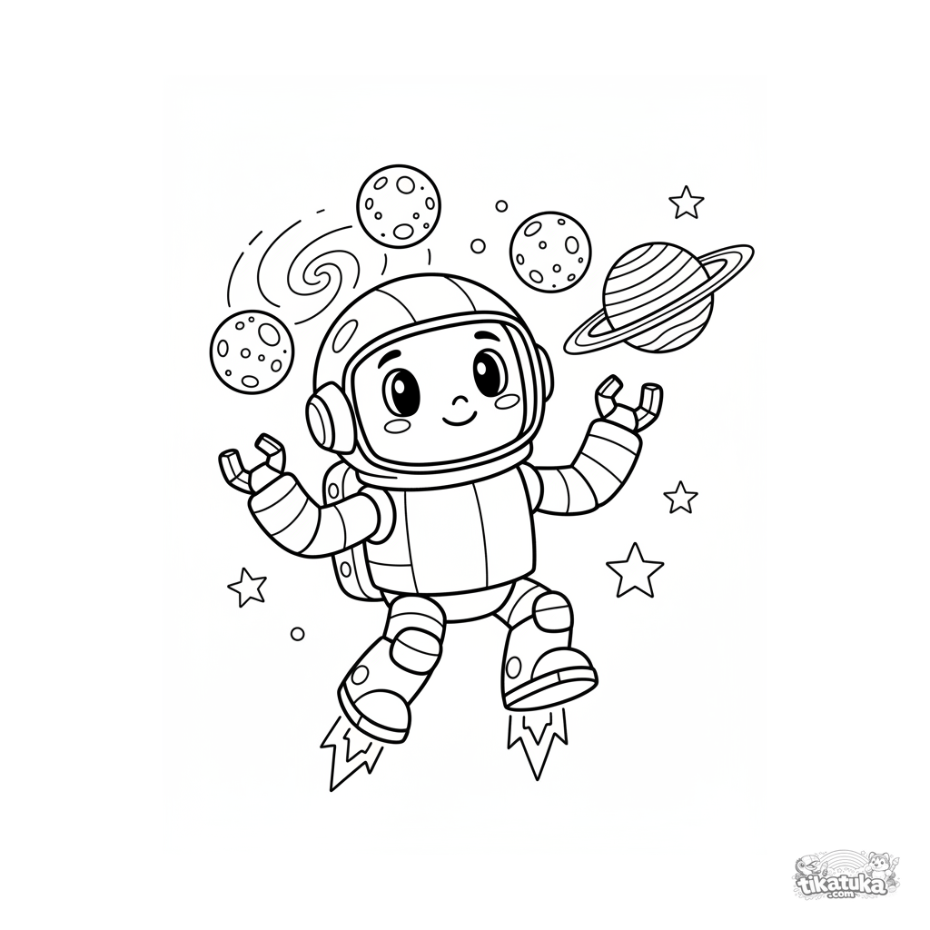 Página para colorear de un robot astronauta amigable haciendo malabarismos con lunas pequeñas en el espacio cerca de un planeta anillado. Para niños de 5 a 8 años. Una divertida escena espacial sobre fondo blanco.