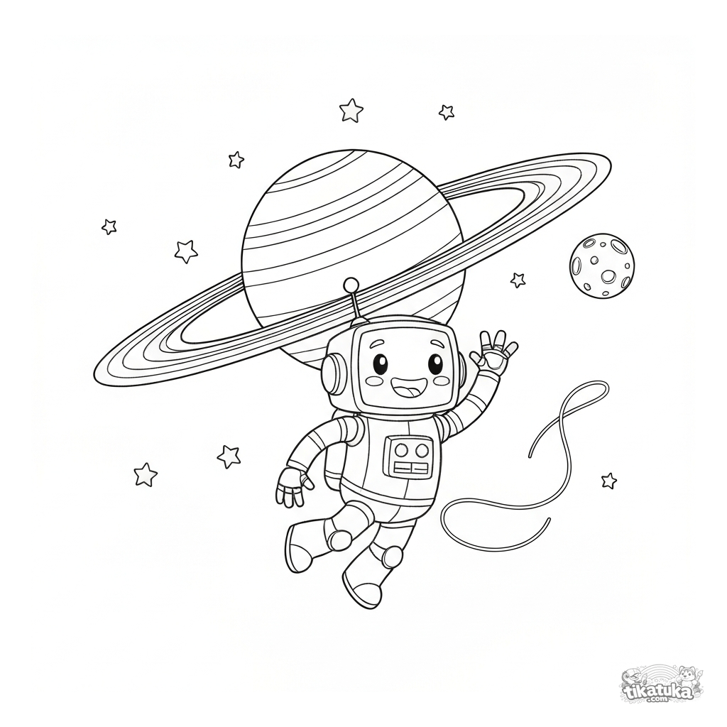Página para colorear de un robot astronauta amigable flotando en el espacio cerca de un planeta gigante anillado. Para niños de 5 a 8 años.