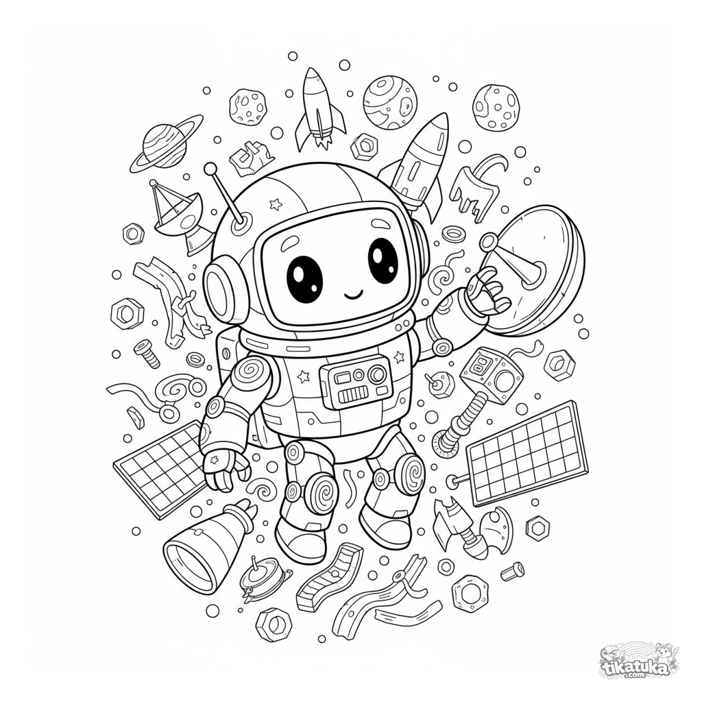 Página para colorear de un robot astronauta amigable flotando en un cementerio espacial, usando un brazo magnético para recoger piezas. Para 8-12 años. El robot examina una antena parabólica doblada con ojos curiosos.