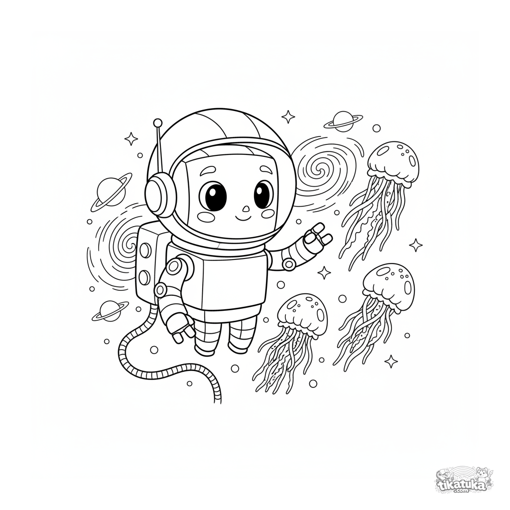 Página para colorear espacial de un robot astronauta encontrando medusas espaciales brillantes entre estrellas y nebulosas. Para niños de 5 a 8 años.