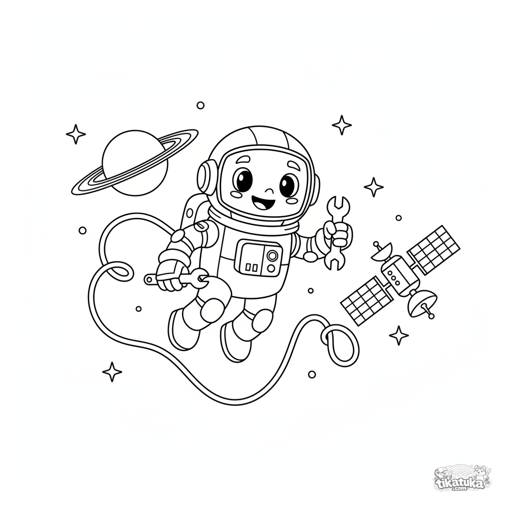 Página para colorear espacio: un robot astronauta amigable flota junto a un satélite. Para niños de 5 a 8 años.