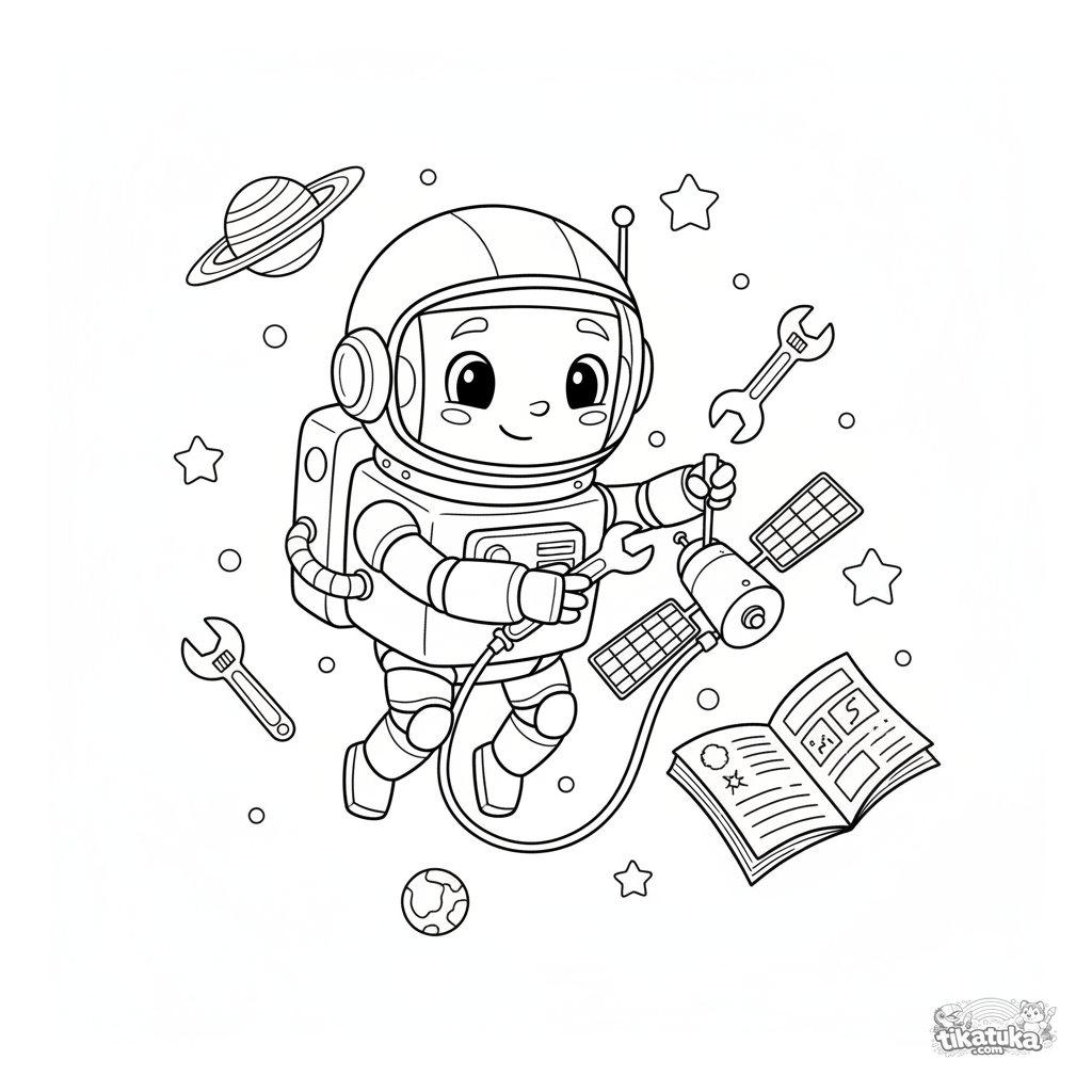 Página para colorear difícil: un robot en traje espacial repara un satélite en el espacio exterior. Para niños de 8 a 12 años. Escena con una correa, herramientas y planetas perfilados al fondo.
