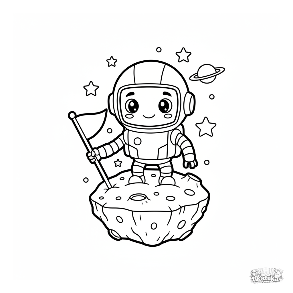 Página para colorear de un robot astronauta plantando bandera en un asteroide. Para niños pequeños de 2 a 5 años.