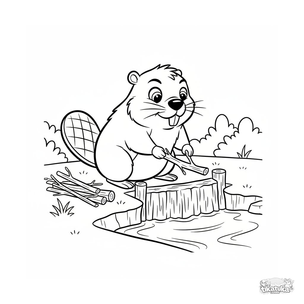 Página para colorear para niños 4-6: un castor de dibujos animados trabajador construye una pequeña presa de ramitas en un arroyo. Escena divertida y educativa de la vida animal.
